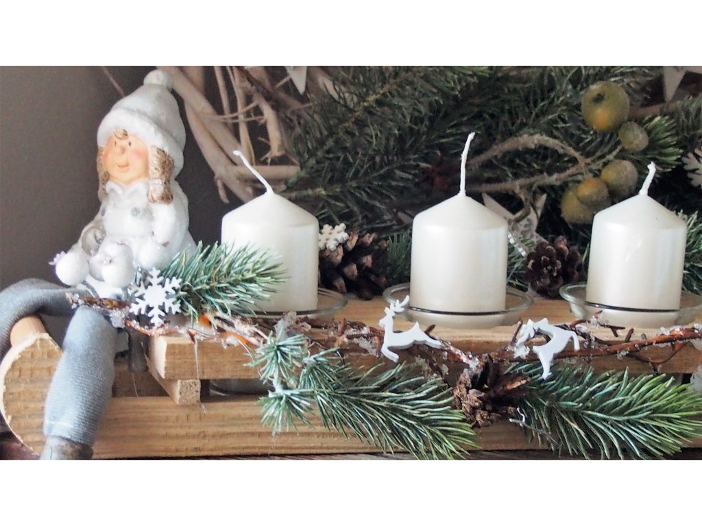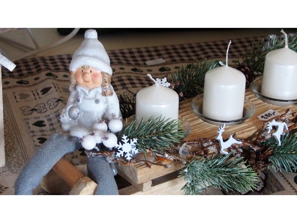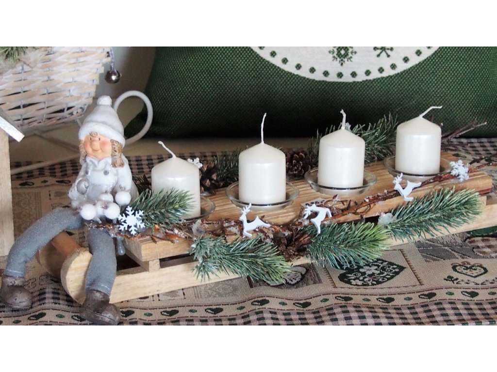 Věneček o prům. cca 30cm. Trvalá dekorace v kombinaci třpitivé bílé a přírodního dřeva s rolničkou.