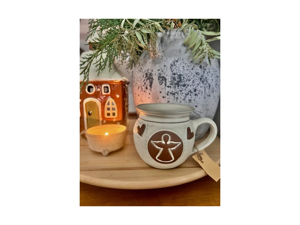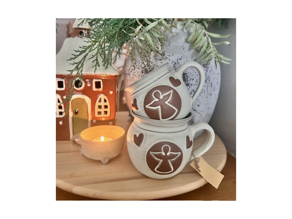 Jemný motiv anděla a srdíček dodává hrnku osobitý styl, ideální pro vaše oblíbené nápoje.